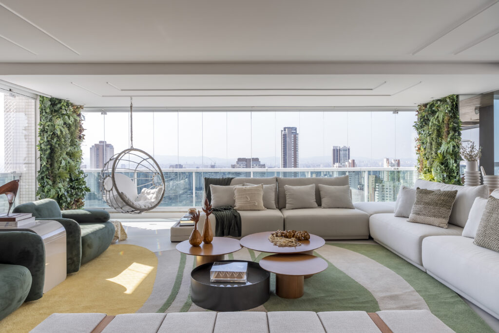 A área social foi pensada para receber com conforto e elegância, com uma disposição que favorece o convívio. Como destaque, a cadeira de balanço suspensa traz leveza e personalidade ao ambiente, reforçando o conceito de aconchego em cada detalhe.